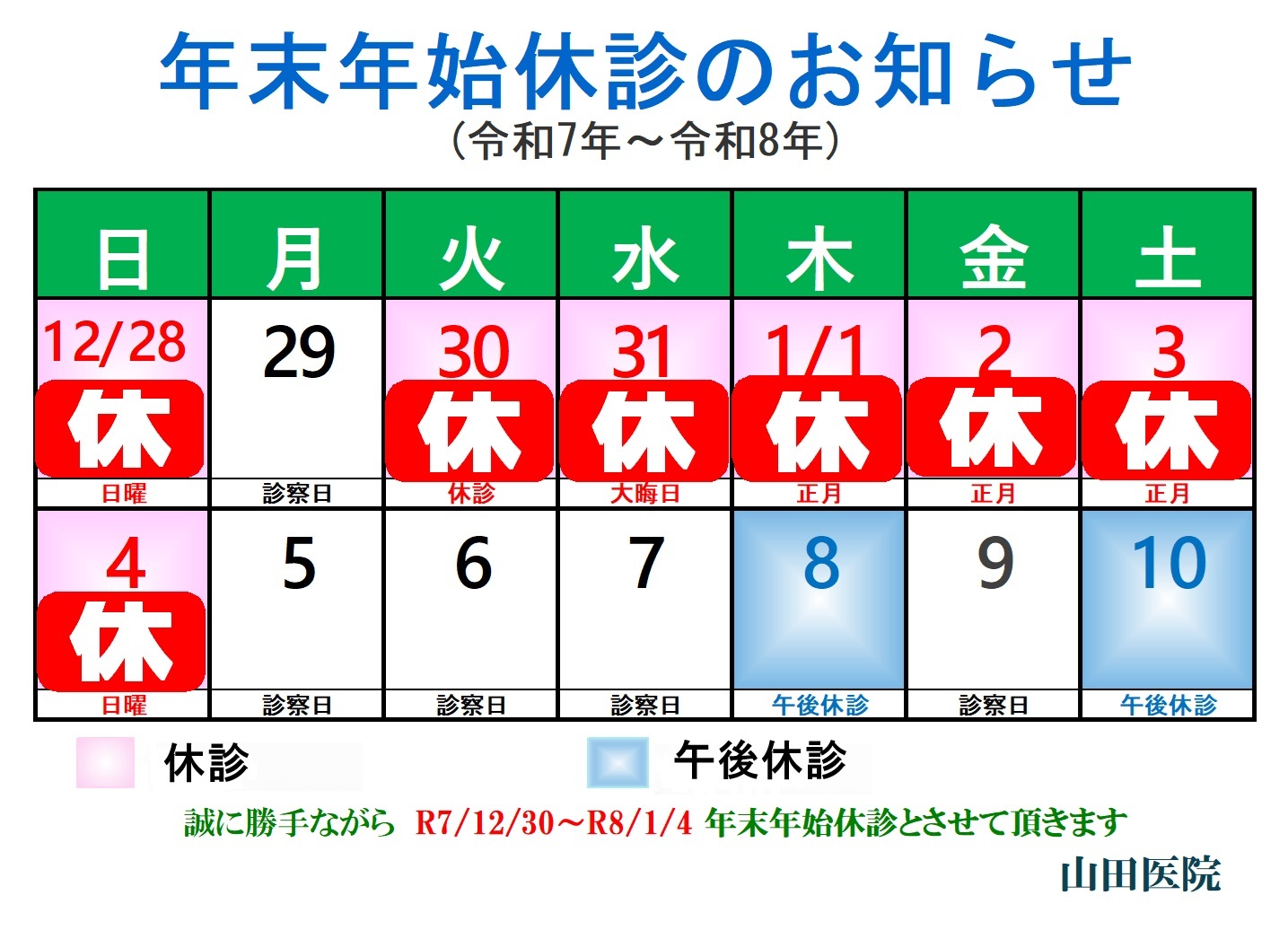 誠に勝手にながらR7年12月30日(火)~R8年1月4(日)まで年末年始休診とさせていただきます。